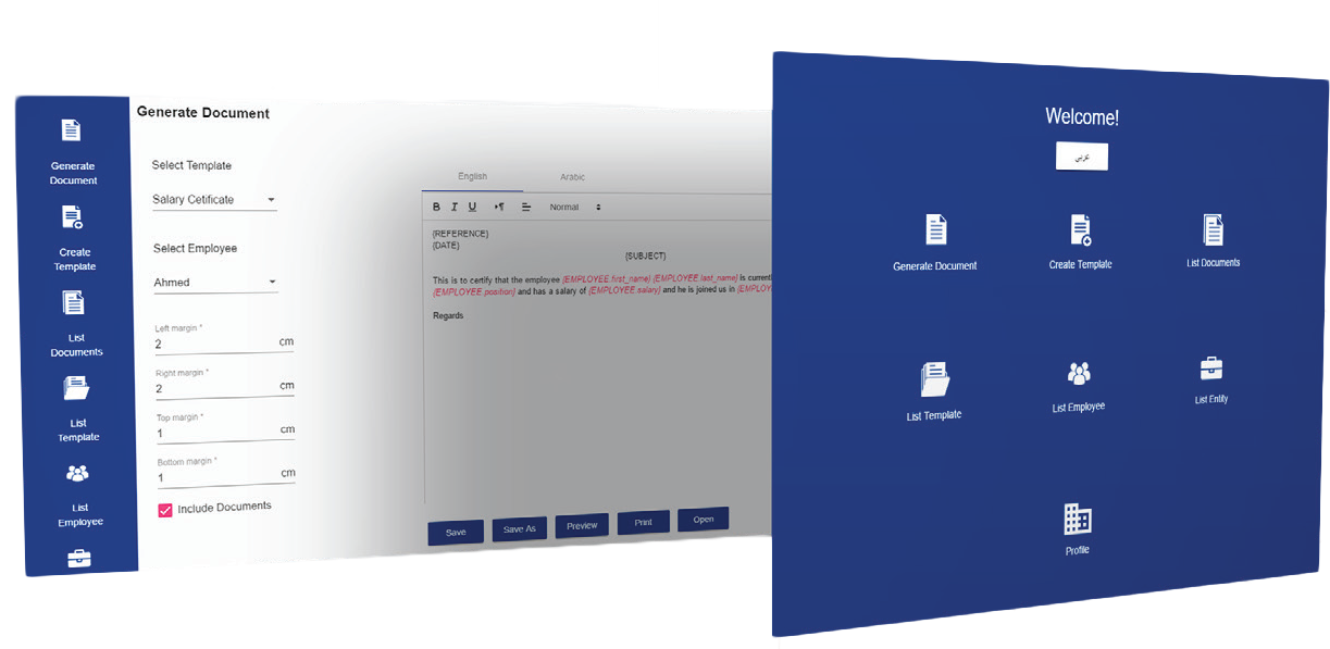 A project that helps Administrators in creating and customizing templates, then generating documents and reports in few clicks. It’s a simple and unique Webapp for generating and regulating HR related documents, as an example.